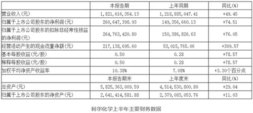 利尔化学股份有限公司(以下简称“利尔化学”)发布了2018年半年报显示,利尔化学实现营业收入18.21亿元,同比增长49.45%;实现归属于上市公司股东的净利润2.61亿元,同比增长74.51%。