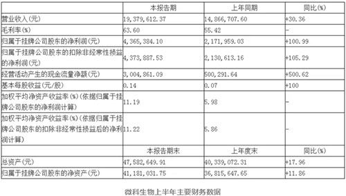 辽宁微科生物工程股份有限公司(下称微科生物)2018年半年报显示,公司实现营业收入0.19亿元,同比增加30.36%。