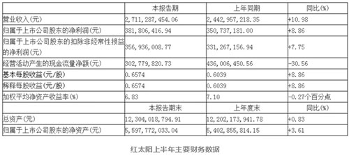 近日,南京红太阳股份有限公司(以下简称“红太阳”)发布了2018年半年度报告。报告期内,红太阳实现营业收入27.11亿元,同比上涨10.98%,其中,生物工程农业(生化环保农药、生化动物营养及中间体等,统筹“农药类”)销售收入26.89亿元,同比增长10.42%;归属于上市公司股东的净利润3.81亿元,同比上涨8.86%。