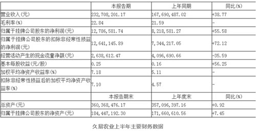 安徽久易农业股份有限公司(下称久易农业)2018年半年报显示,公司资产总额达3.60亿元,较期初增长0.92%;公司实现营业收入2.32亿元,同比增长38.77%;营业收入和净利润较上年同期均有较大幅度增长,主要受供需结构持续改善,产品销量、产品价格、毛利率均有所上涨所致。