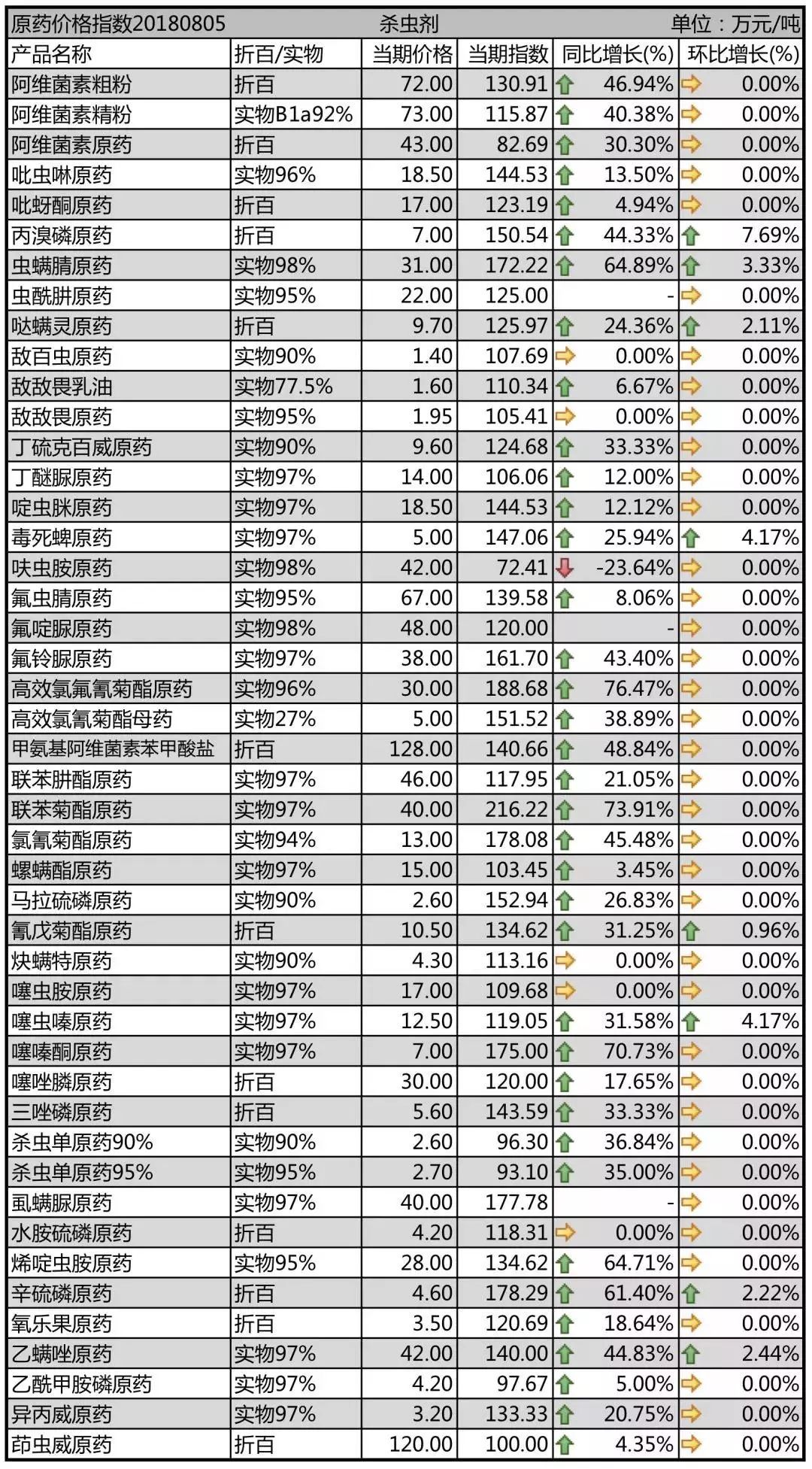 环比上周,丙溴磷原药、虫螨腈原药、哒螨灵原药、毒死蜱原药、氰戊菊酯原药、噻虫嗪原药、辛硫磷原药、乙螨唑原药等上涨,其余杀虫剂品种稳定为主。