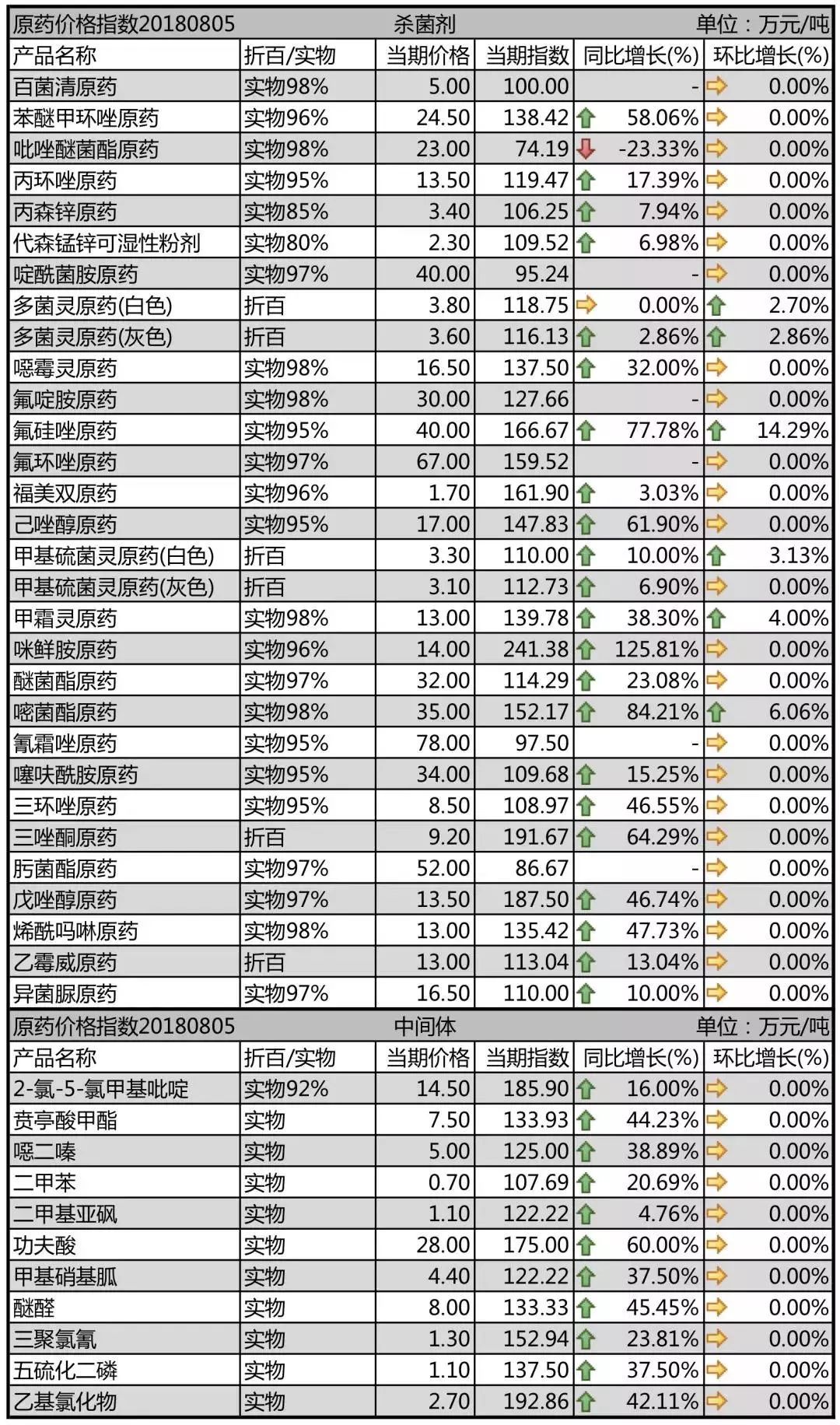 环比上周,多菌灵原药、氟硅唑原药、甲基硫菌灵原药、甲霜灵原药、嘧菌酯原药等品种上涨,其余杀菌剂和中间体品种稳定为主。